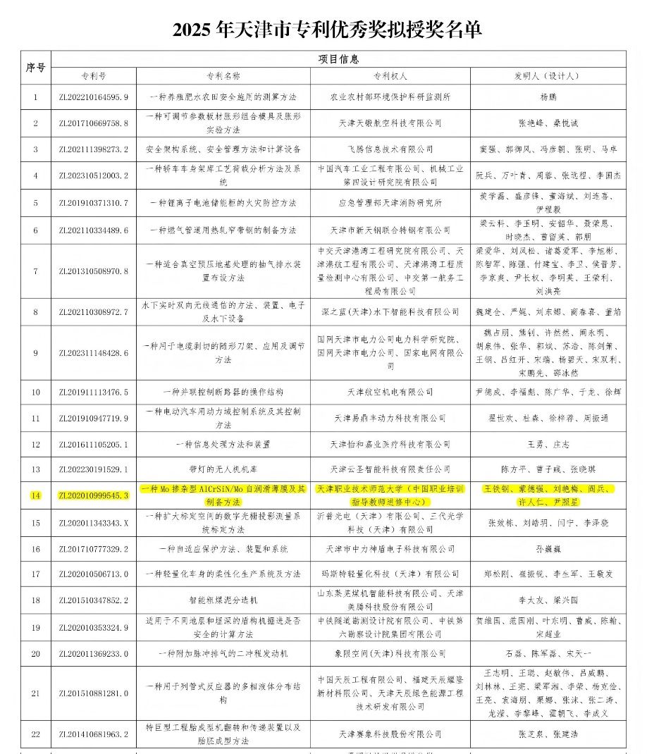 本网讯【通讯员 张恩凤】日前,天津市知识产权局正式公布了2025年天津市专利奖获奖名单,我校机械工程学院王铁钢教授团队研发的“一种Mo掺杂型AlCrSiN/Mo自润滑薄膜及其制备方法(...
